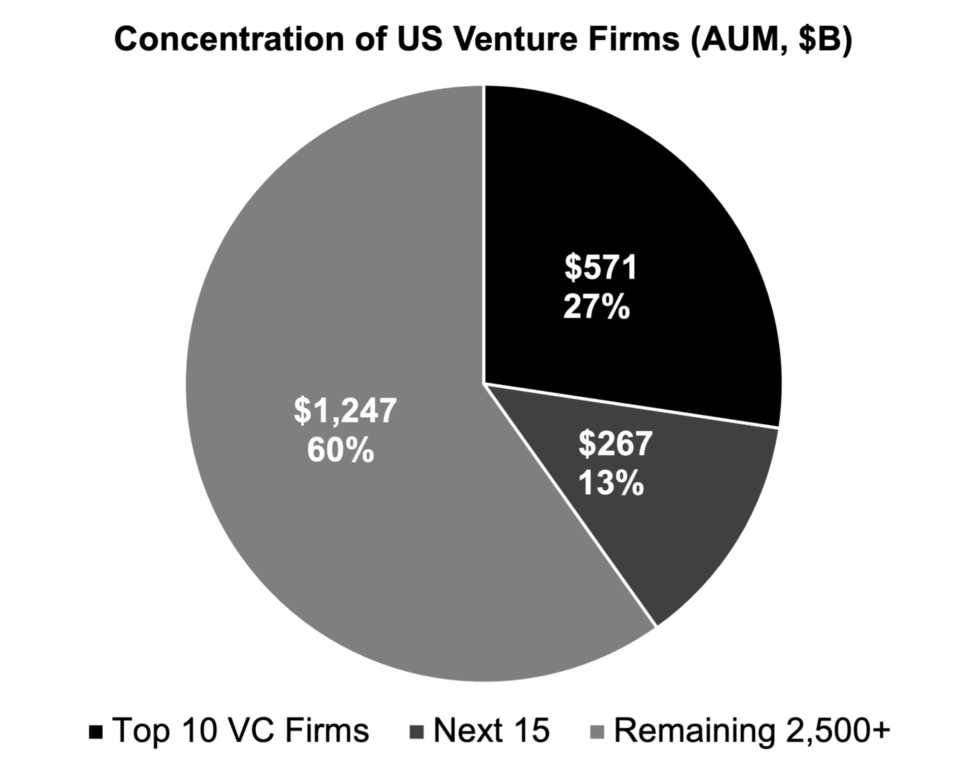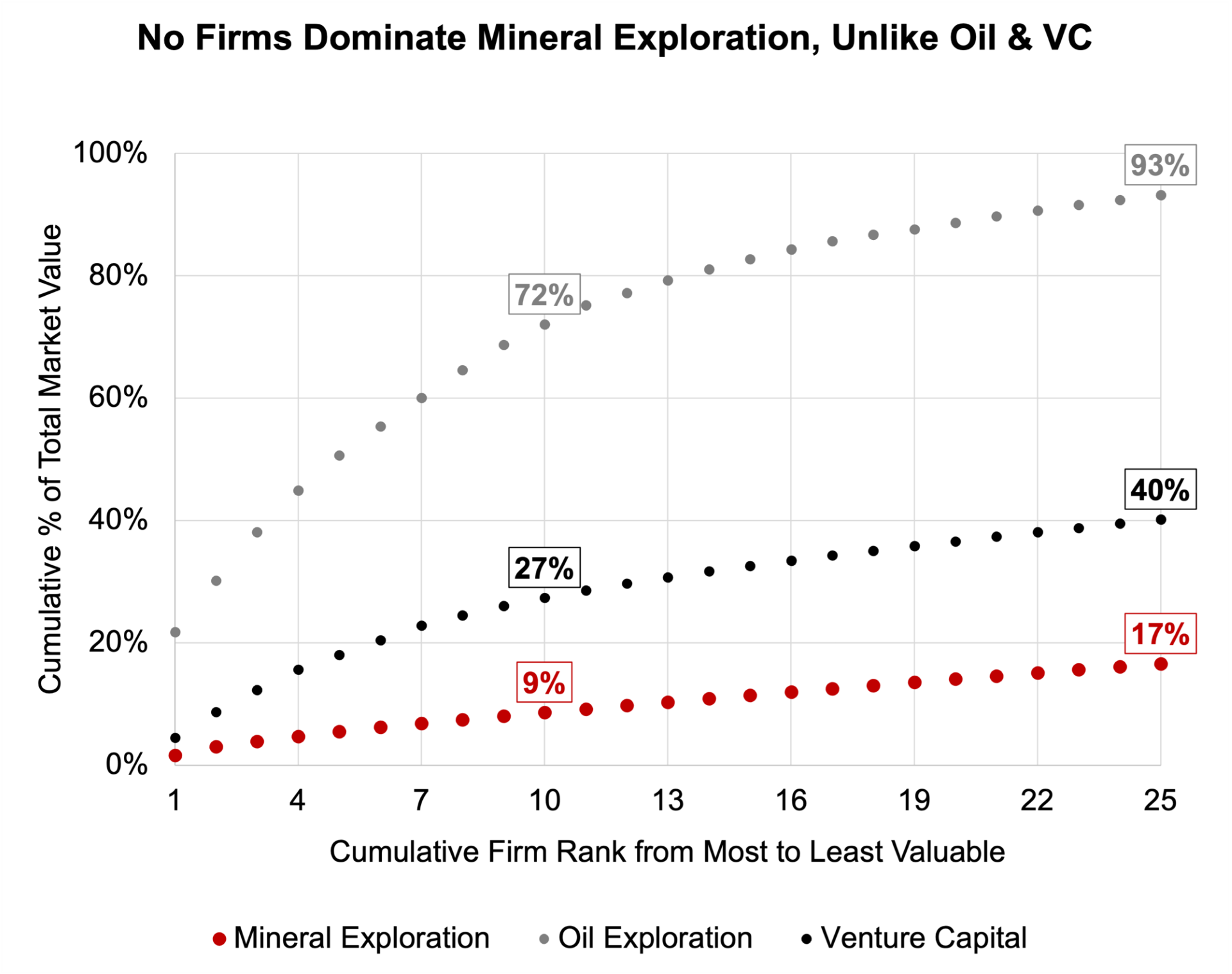 This dictates their entire model. A VC's primary function is disciplined portfolio construction, making many "shots on goal" to increase the chance of hitting an outlier [6]. This structure requires VCs to be unsentimental about failure. Companies that fail to gain traction are systematically cut off from follow-on capital, freeing up resources to focus on potential winners. The recent trend toward "megafunds" represents a powerful form of consolidation [7], concentrating immense capital on the most promising startups and starving competitors. For context, the top 10 VCs now control 27% of the industry’s value (proxied by AUM) [8] — standing in stark contrast to the fragmented mining exploration sector, where the top 10 firms only control 9% of the industry’s value.