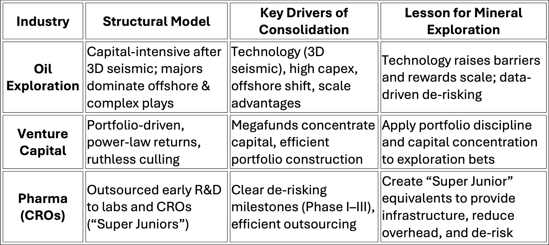 The structural flaws of junior mining become clear when contrasted with other industries that manage high-risk, capital-intensive projects. These sectors provide a roadmap for consolidation.